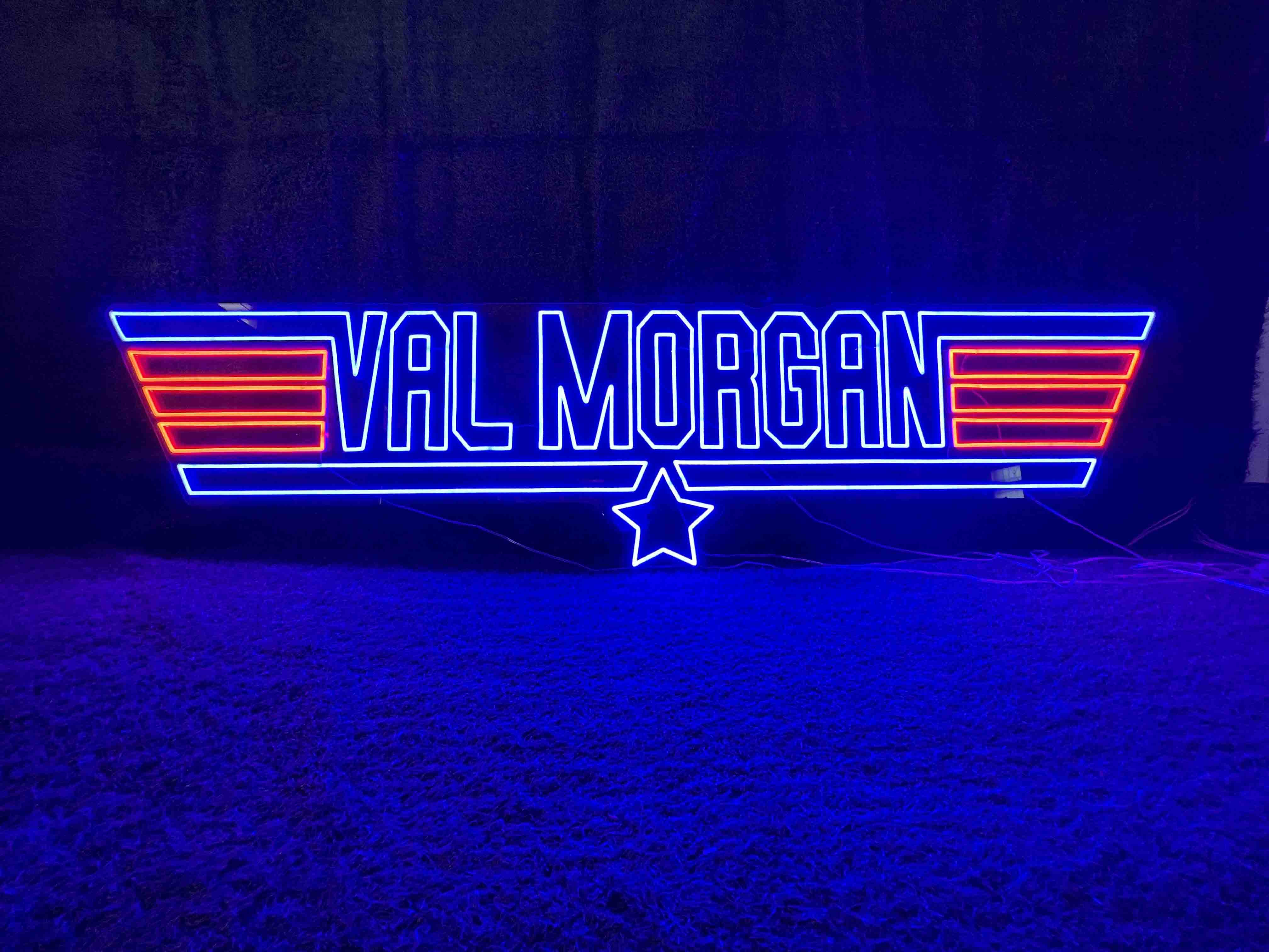 We designed a custom LED neon sign that features the iconic Val Morgan logo, with clean lines and a modern feel. The design includes the signature blue and red neon colors, which are perfect for ensuring visibility and creating a striking contrast, even in low-light environments. The star icon at the center of the design represents Val Morgan’s excellence in cinema entertainment.