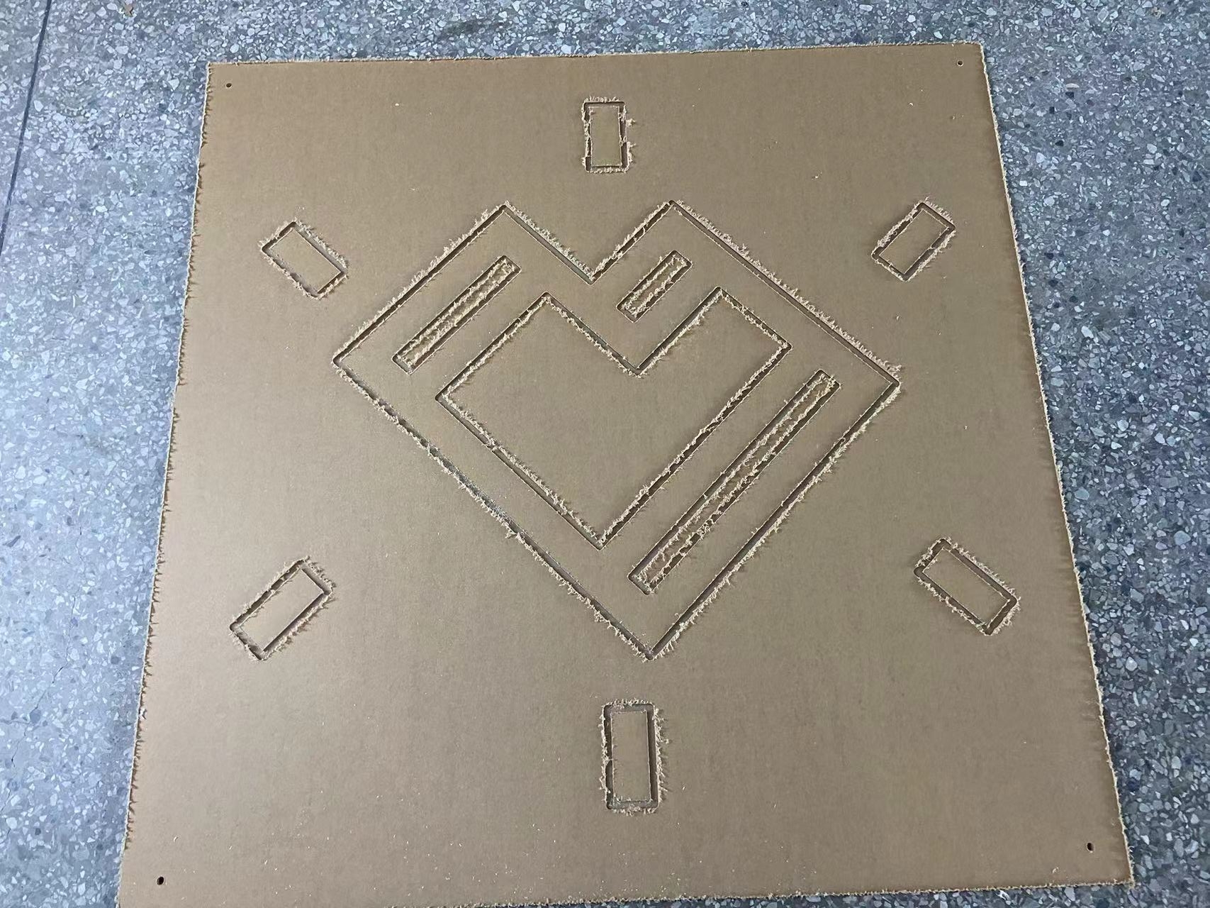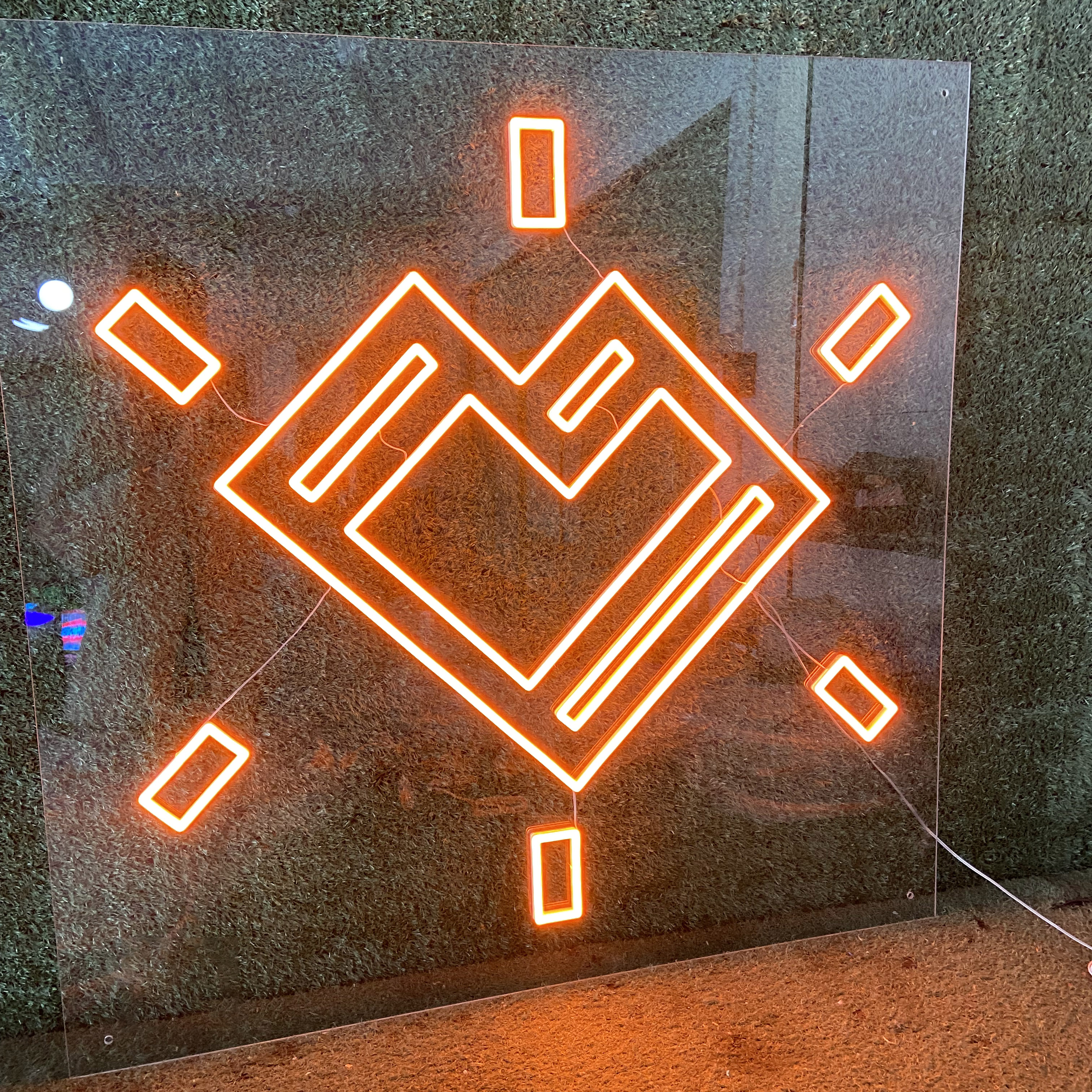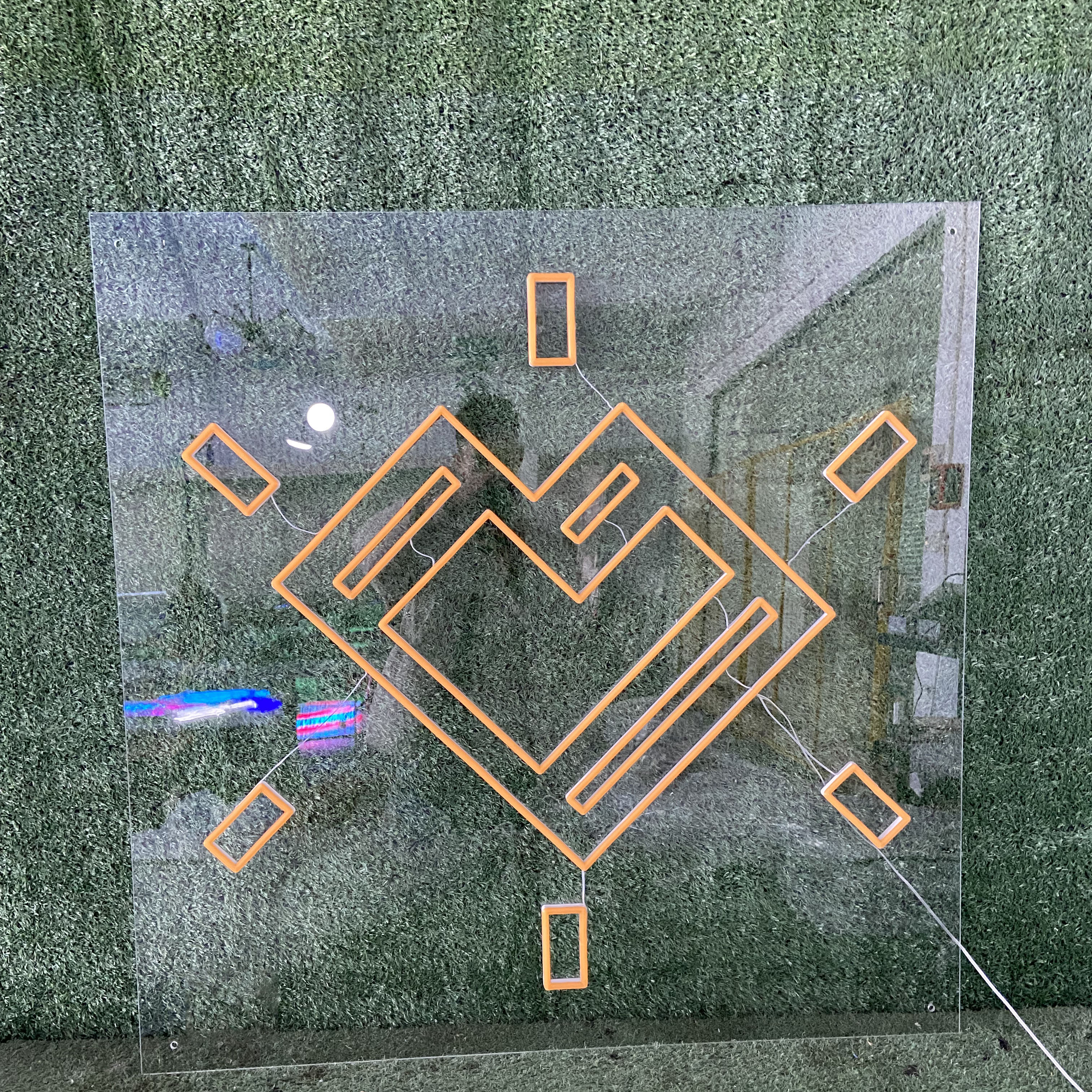 This project features a fully custom LED neon sign with a geometric abstract design, mounted on a clear acrylic panel. The neon tubing is arranged in a symmetrical layout, combining sharp angles and rectangular elements to create a modern, high-end visual effect.