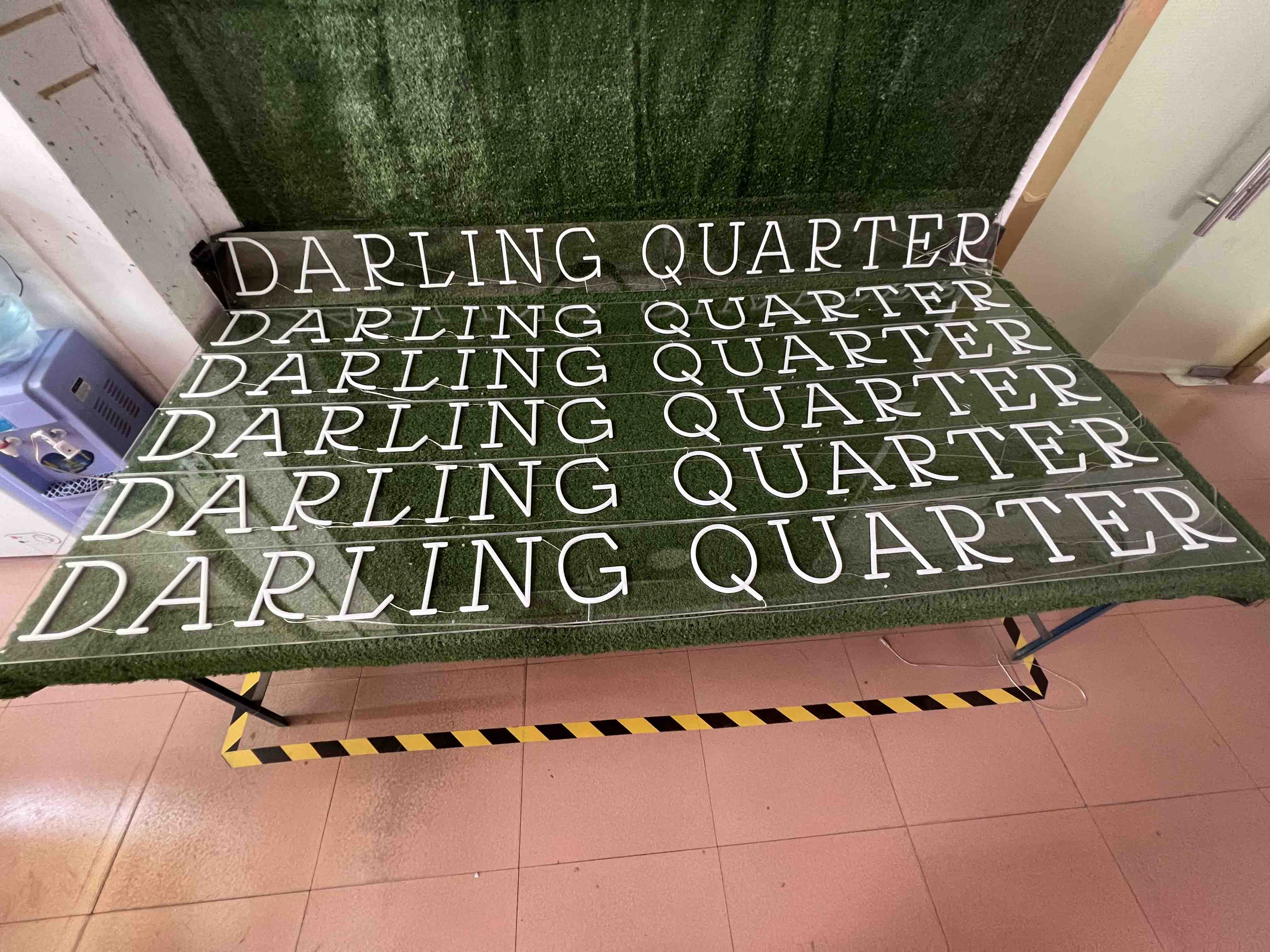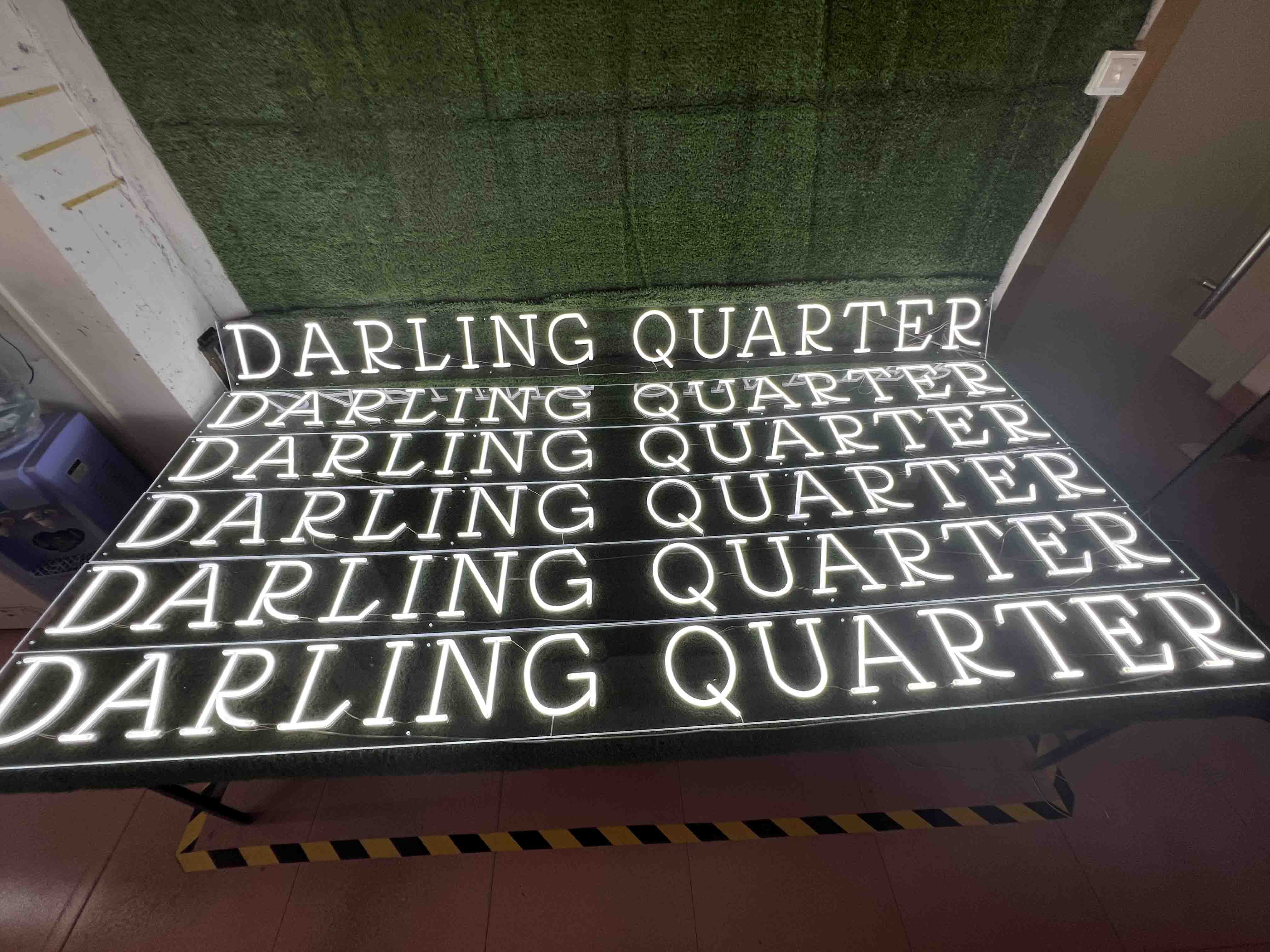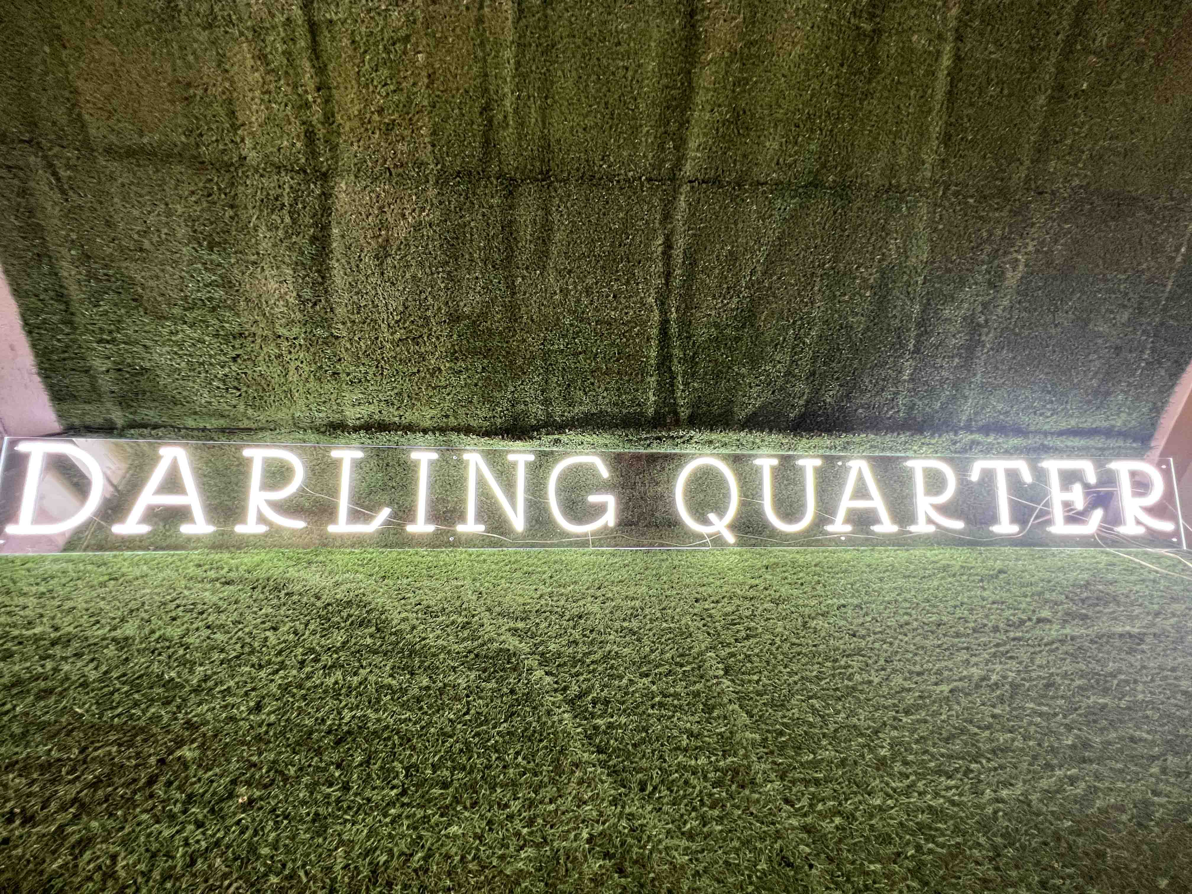 This project features a custom LED neon sign with individual channel letters, spelling “DARLING QUARTER.” The sign was designed in warm white LED neon tubing and mounted on a clear acrylic backing, creating a clean, modern, and premium look for a commercial venue.