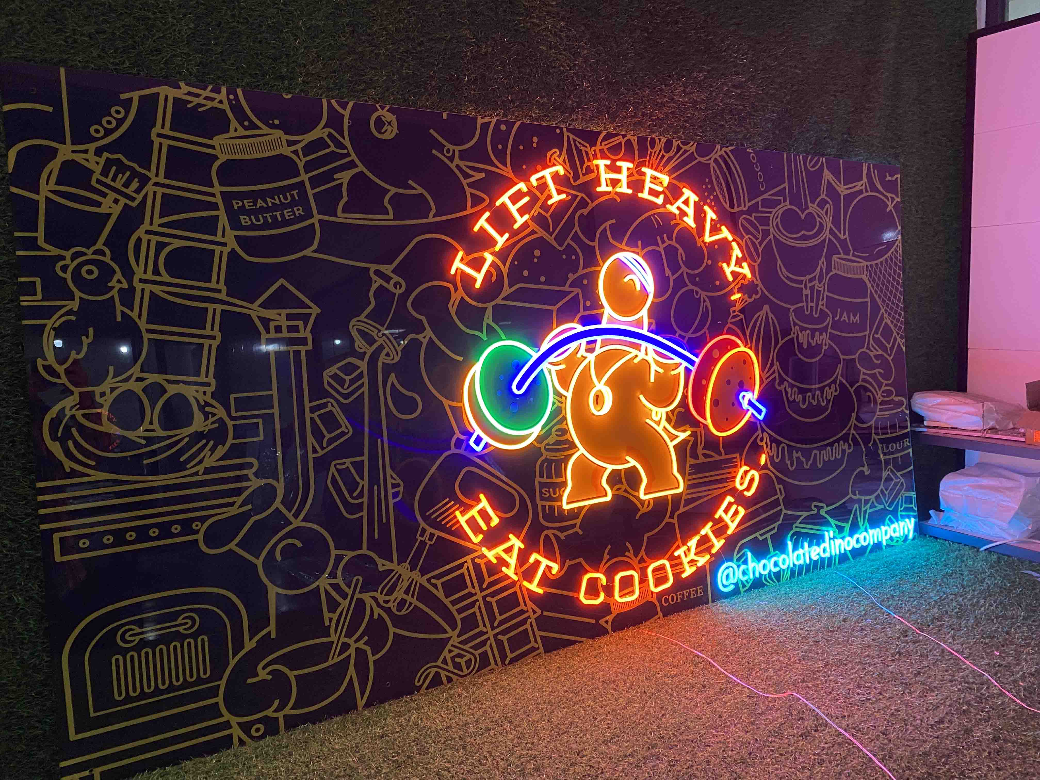 This custom LED neon sign features a bold lips graphic combined with a stylized “Devour” logo, crafted with premium LED neon flex and mounted on a clear acrylic backing. The design delivers a high-impact visual effect, ideal for brands that want to stand out in retail, hospitality, nightlife, and promotional environments.