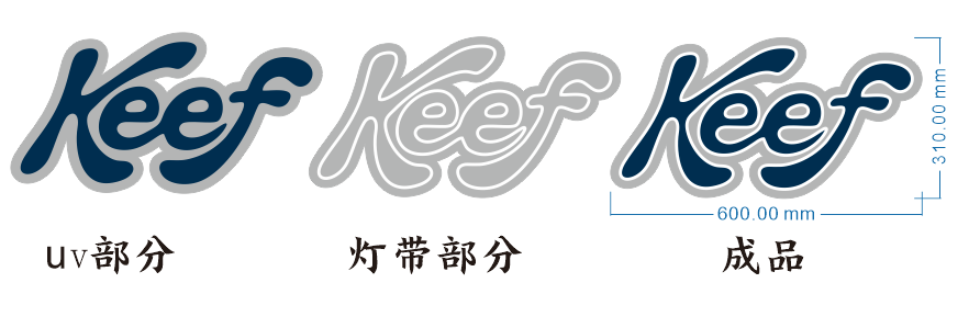 The Keef logo features smooth, flowing script, which we recreated using precision-cut acrylic backing and flexible LED neon tubing. Key design highlights include: