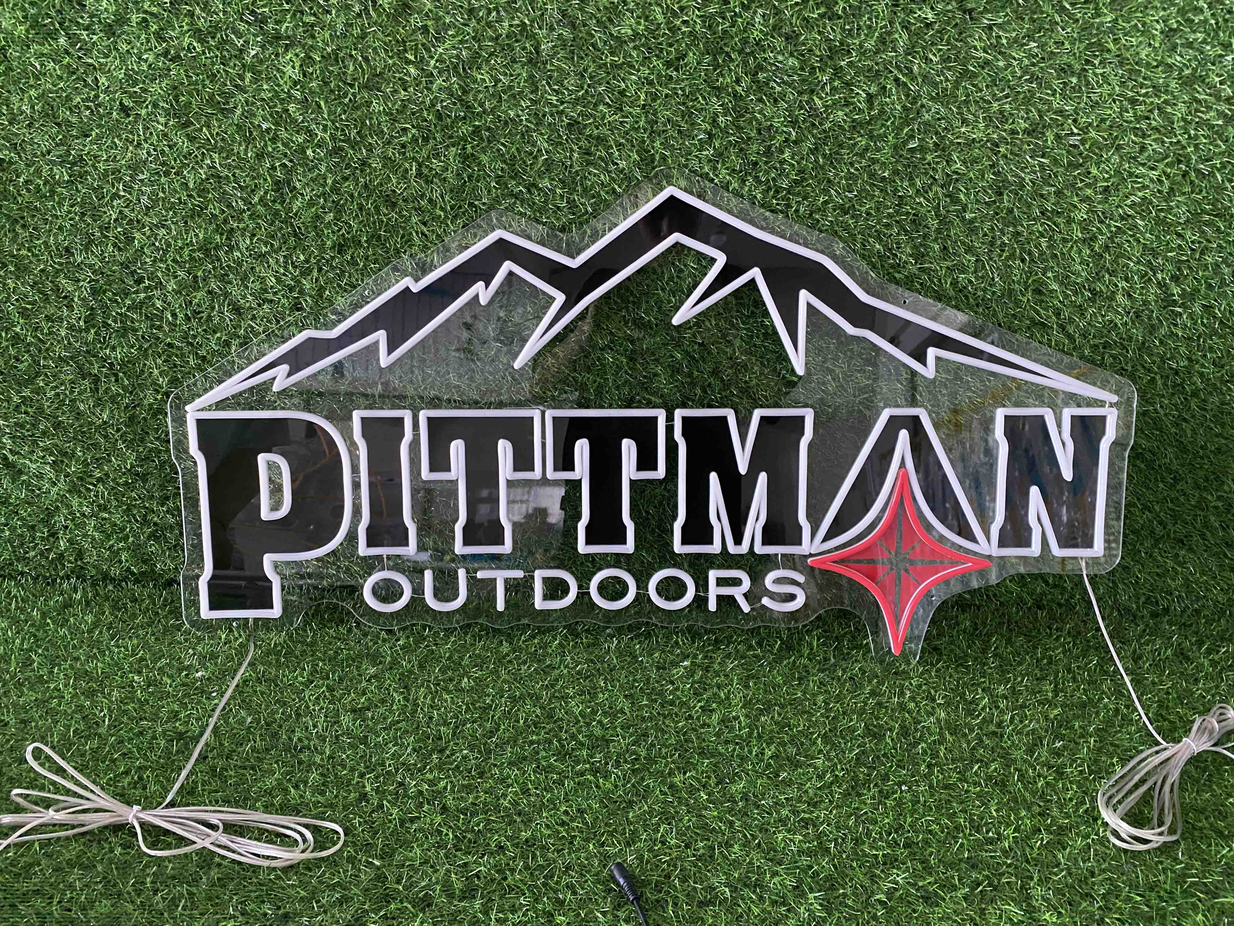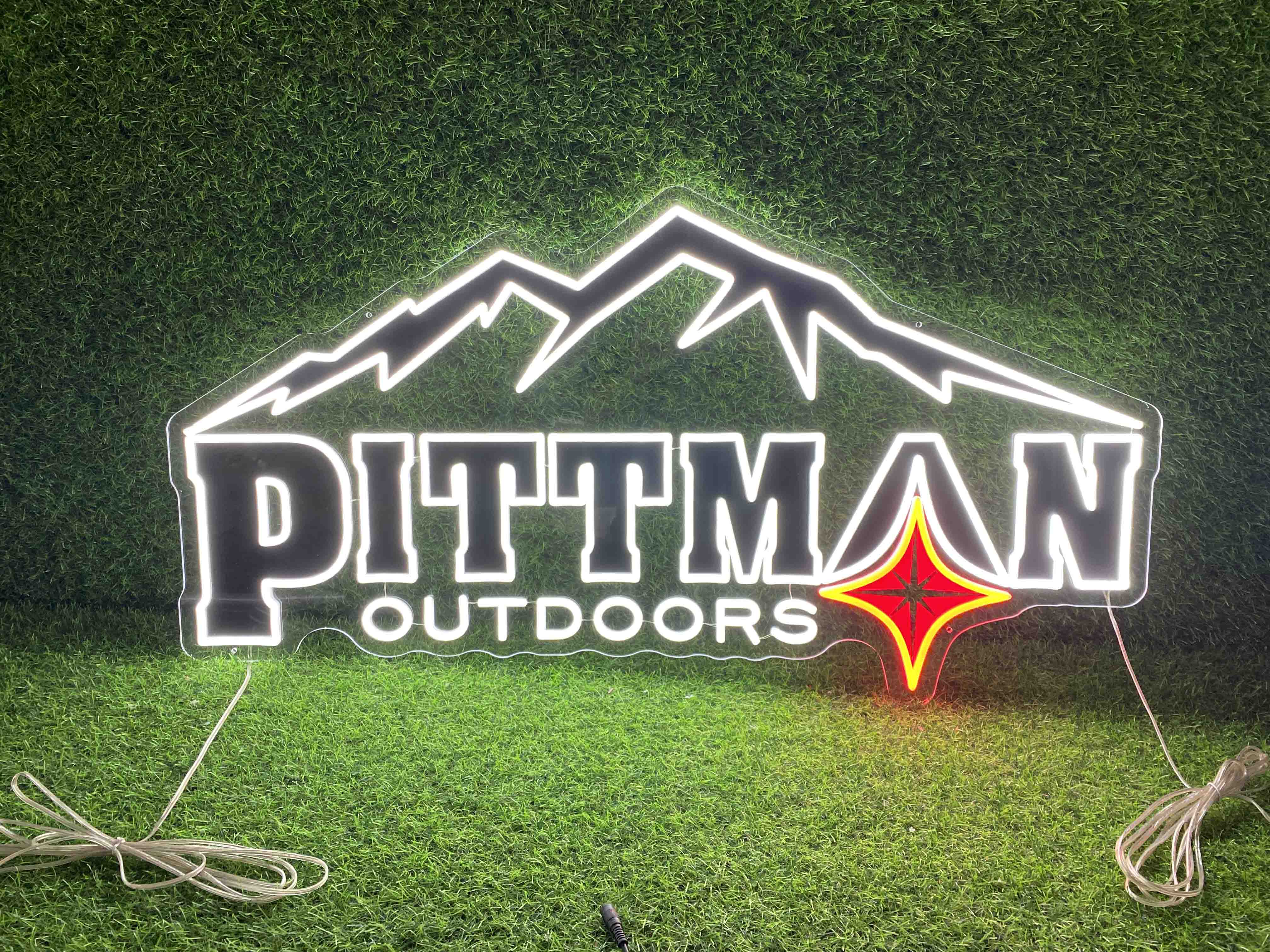 We designed a custom LED neon light sign for Pittman Outdoors, combining their iconic mountain logo and distinctive brand name. The sign features bright, vibrant white and red neon-like LEDs for a striking effect. This solution enhances visibility while being energy-efficient, long-lasting, and eco-friendly.